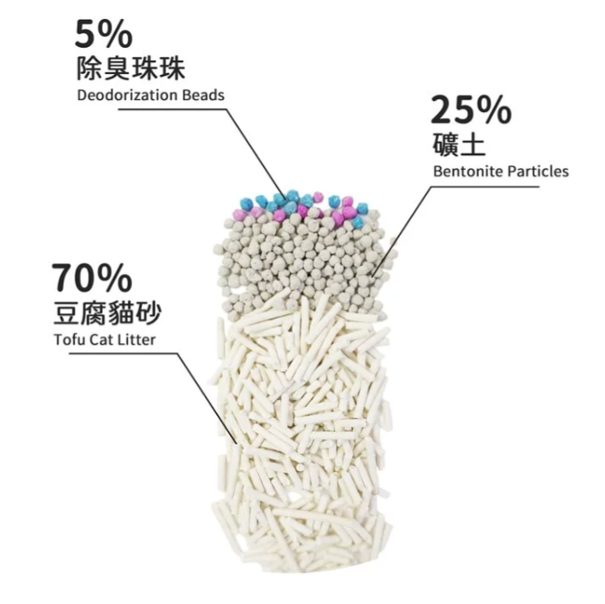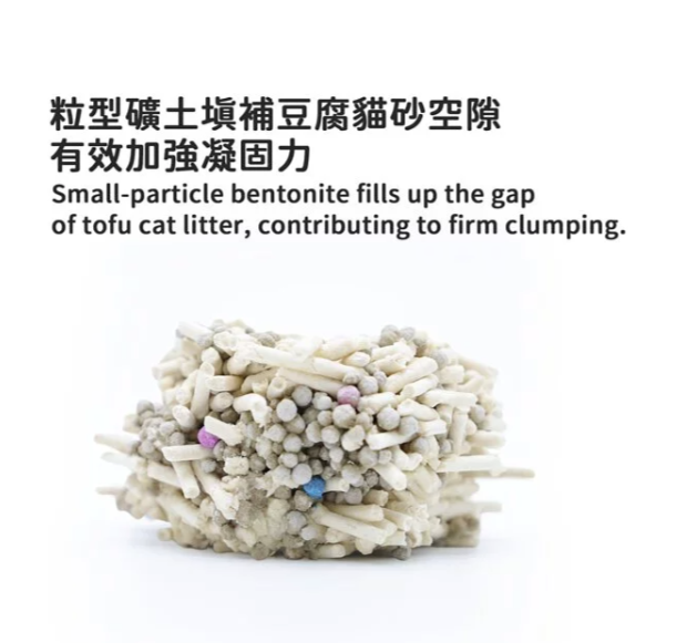 粒型礦土填補豆腐貓砂空隙,加強凝固力。