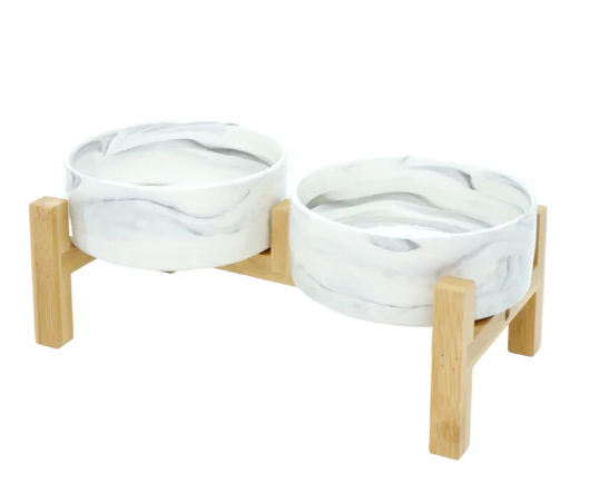 Dah 陶瓷餵食/水碗連高腳竹木碗架 (雲石)