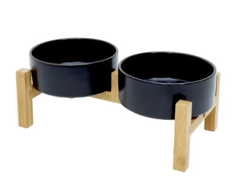 Dah 陶瓷餵食/水碗連高腳竹木碗架 (黑)